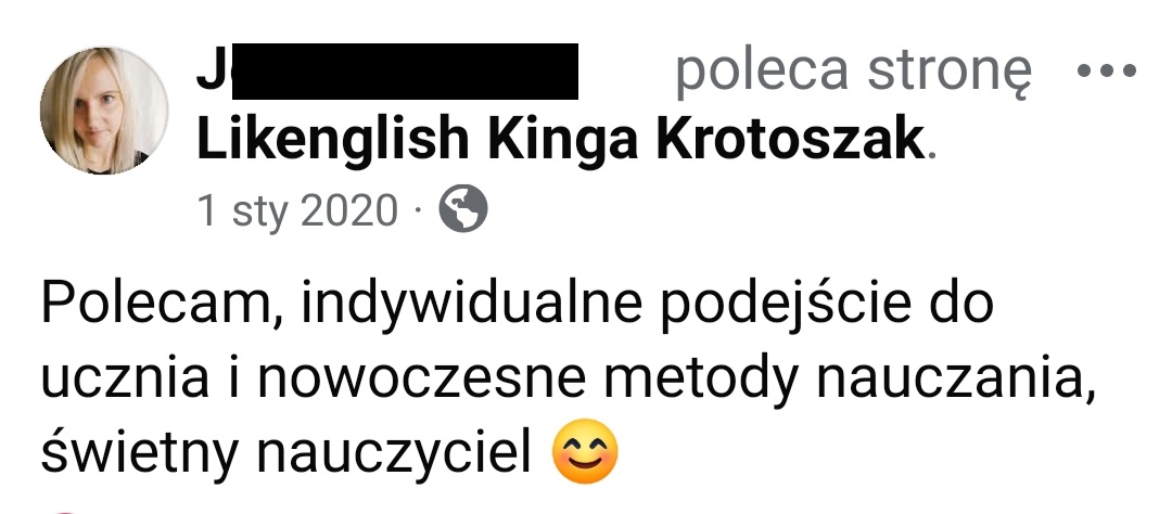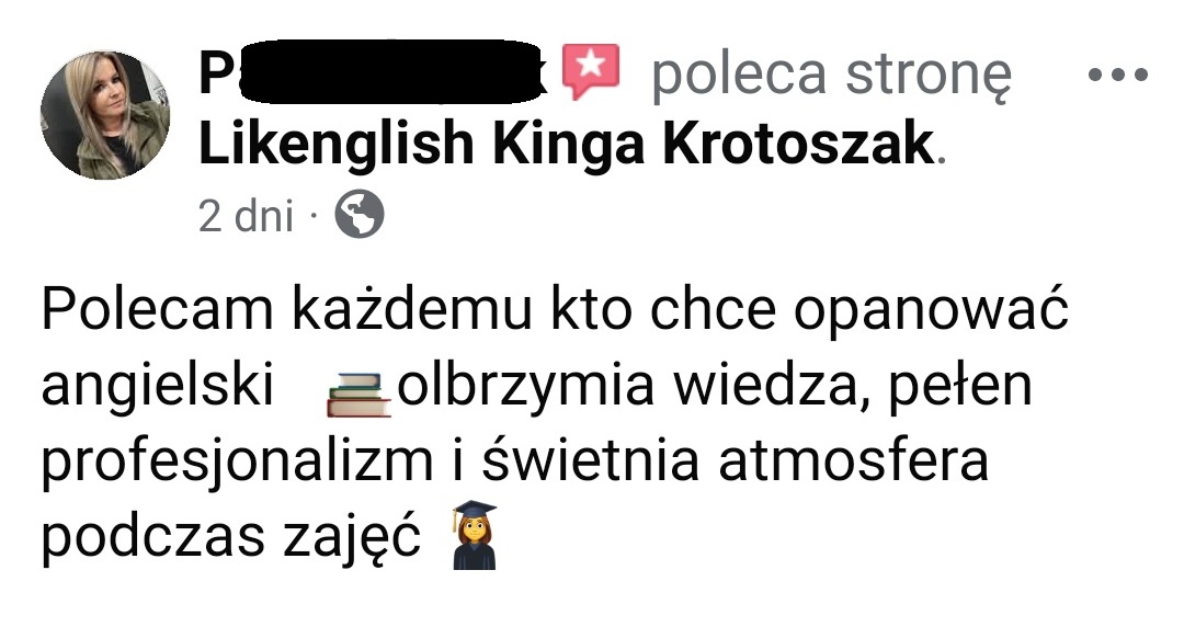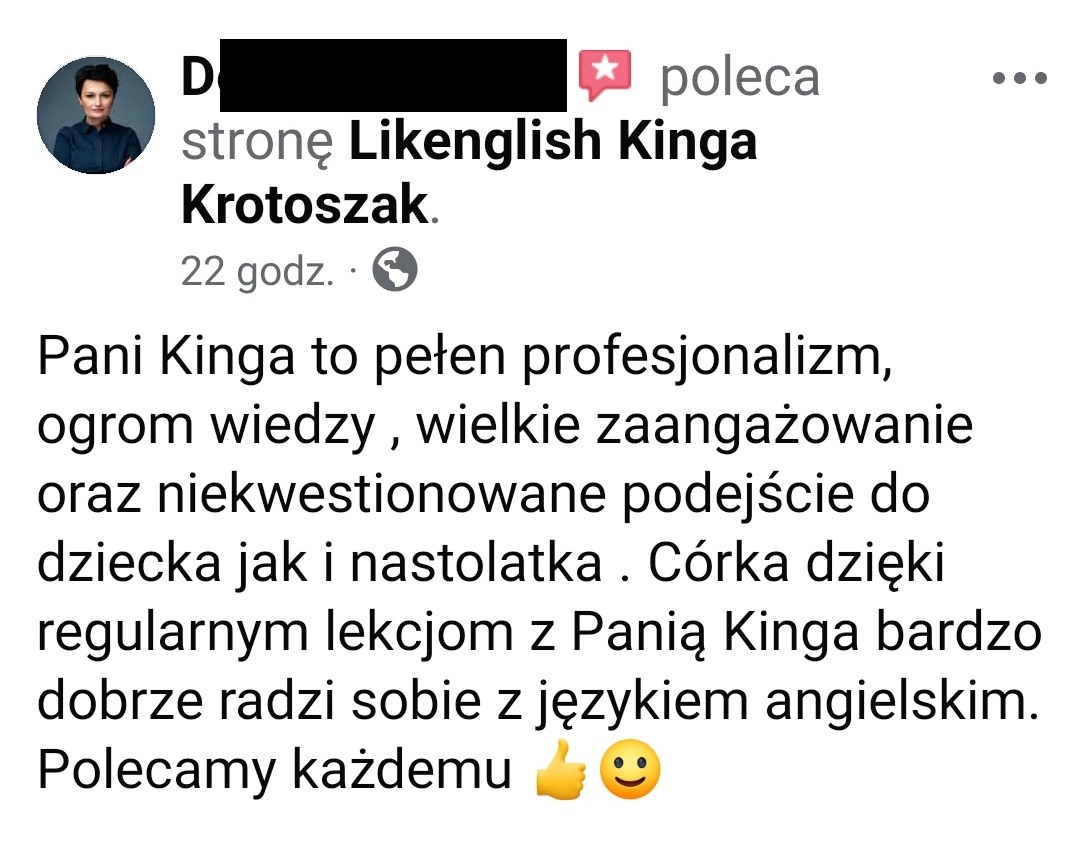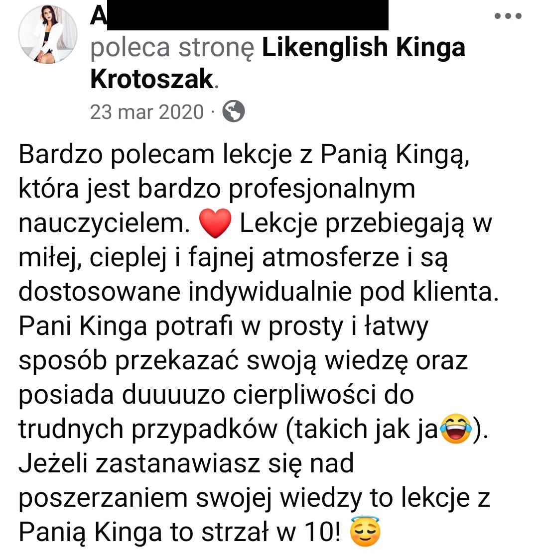 Jestem magistrem filologii angielskiej, lektorką języka angielskiego z ponad 15-letnim doświadczeniem oraz certyfikowanym neuro-language coachem. Od wielu lat prowadzę zajęcia indywidualne i grupowe, a także pracuję jako wykładowczyni akademicka na jednej z uczelni w rejonie Zagłębia Dąbrowskiego. Jestem również właścicielką szkoły językowej LIKENGLISH Kinga Krotoszak.